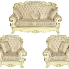 Красивое название для красивого комплекта. Акцент сделан на богатый резной декор каркаса молочного цвета. Его цветочные мотивы изящно сочетаются с рисунком сидения. Диван раскладной трехместный Аделина крем. Два варианта исполнения ткани: бежевое золото или бирюза.